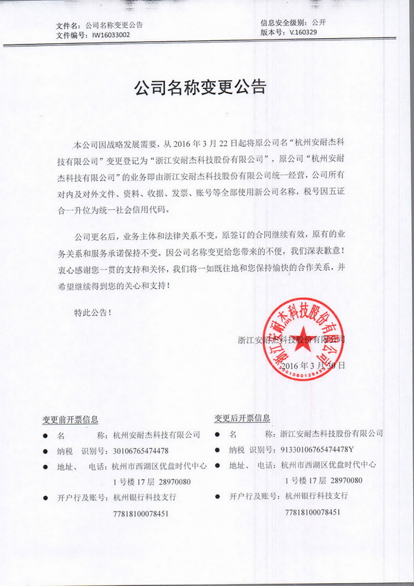 本公司因戰(zhàn)略發(fā)展需要,從2016年3月22日起將原公司名“杭州安耐杰科技有限公司”變更登記為“浙江安耐杰科技股份有限公司”,原公司“杭州安耐杰科技有限公司”的業(yè)務(wù)即由浙江安耐杰科技股份有限公司統(tǒng)一經(jīng)營(yíng),公司所有對(duì)內(nèi)及對(duì)外文件、資料、收據(jù)、發(fā)票、賬號(hào)等全部使用新公司名稱,稅號(hào)因五證合一升位為統(tǒng)一社會(huì)信用代碼。